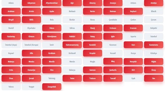 Adıyaman, Afyonkarahisar, Ağrı, Aksaray, Amasya, Antalya, Ardahan, Artvin, Aydın, Bartın, Batman, Bayburt, Bingöl, Bitlis, Düzce, Elazığ, Erzincan, Erzurum, Gaziantep, Giresun, Gümüşhane, Hakkari, Hatay, Iğdır, Kahramanmaraş, Karabük, Kars, Kastamonu, Kilis, Kırıkkale, Kırşehir, Malatya, Manisa, Mardin, Muş, Nevşehir, Niğde, Ordu, Rize, Samsun, Şanlıurfa, Siirt, Sinop, Sivas, Şırnak, Tokat, Trabzon, Tunceli, Van, Zonguldak.