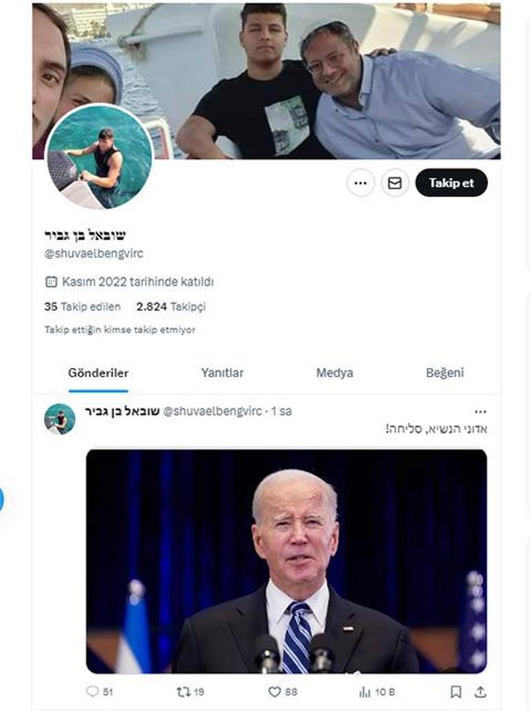 İsrail Ulusal Güvenlik Bakanı'nın açıklamasının ardından oğlu Shuvael Ben-Gvir de X hesabından depreme yol açan mesajını sildi, Biden'ın fotoğrafını "Sayın Başkan, üzgünüm" mesajıyla yeniden paylaştı.