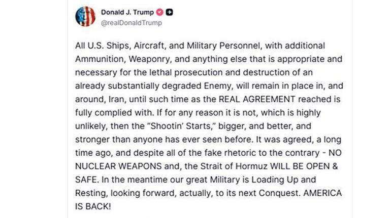 “ABD’ye ait tüm gemiler, uçaklar ve askeri personel; buna ek olarak mühimmat, silahlar ve zaten büyük ölçüde zayıflatılmış bir düşmanın ölümcül şekilde bastırılması ve tamamen yok edilmesi için gerekli ve uygun olan her şey, GERÇEK ANLAŞMA tam anlamıyla uygulanana kadar İran’da ve çevresinde kalmaya devam edecektir.