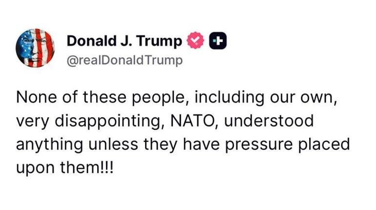 ABD Başkanı Donald Trump, Truth Social'da yaptığı son paylaşımda "Bu insanların hiçbiri — maalesef buna bizimkiler de dahil — NATO dahil olmak üzere, üzerlerinde baskı kurulmadıkça hiçbir şeyi anlamıyor" dedi.