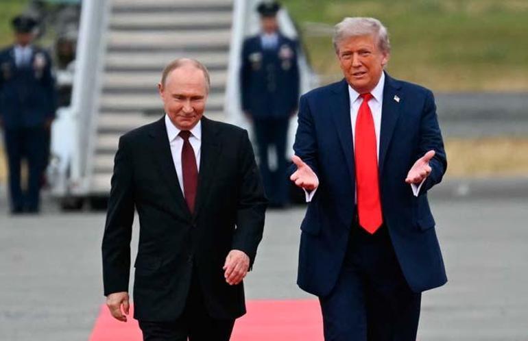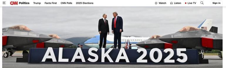 "Trump, Rus lideri sıcak bir şekilde karşıladı. Kara zemin üzerinde yan yana duran liderler, hareket eden basın havuzu önünde, Putin Ukrayna’daki savaşıyla ilgili yoğun sorularla karşılaştı. ABD askeri uçaklarının gürültüsü altında, Rus lider omuz silkti ve kulağına işaret ederek, Ukrayna sivillerini öldürmeyi bırakıp bırakmayacağını soran muhabirleri duymadığını gösterdi."