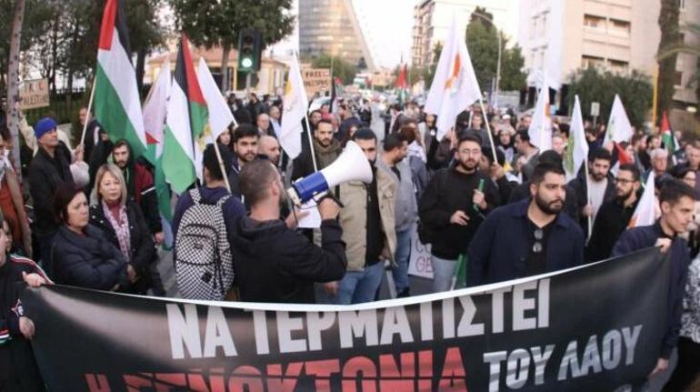 Kalabalık, Herzog'un Kıbrıs'ta "istenmediğini" ilan eden pankartlar taşıdı. Protestocular, "Emperyalist savaşlara hayır", "Özgür Filistin", "Kıbrıs, Filistin, dayanışma" ve "Halkların dostluğu uzun yaşasın" gibi sloganlar attı.