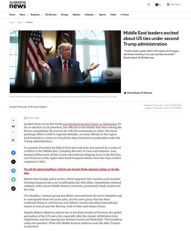Birleşik Arap Emirlikleri merkezli El Arabiya televizyonu ise, 'Orta Doğu liderleri ikinci Trump döneminde ABD ilişkileri için heyecan duyuyor' başlıklı bir haber yayınladı. Orta Doğu'daki ülkelerin Trump yönetiminde daha tahmin edilebilir buldukları ABD politikalarına dönmek için sabırsızlandıkları yorumunu yapan El Arabiya, Trump'ın Amerikan başkanlarının geleneğini bozarak 2017'de ilk yurt dışı ziyaretini Suudi Arabistan'a yaptığını hatırlattı.