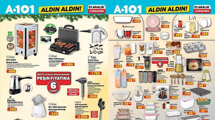 A101 Aldın Aldın aktüel kataloğu yayımlandı. Her hafta Perşembe günü satışa sunulan A101 Aldın Aldın aktüel kataloğu bu kez Çarşamba günü satışa çıkacak. Perşembe günü yeni yılın ilk günü olması sebebiyle A101 mağazalarında bu haftaya özel Aldın Aldın aktüel kataloğu Çarşamba günü raflarda yerini alacak. Satışa sunulacak ürünler arasında yine oldukça fazla seçenek yer alıyor. İşte A101 Aldın Aldın 31 Aralık Çarşamba aktüel kataloğunda yer alan ürünlerin tam ve eksiksiz listesi...