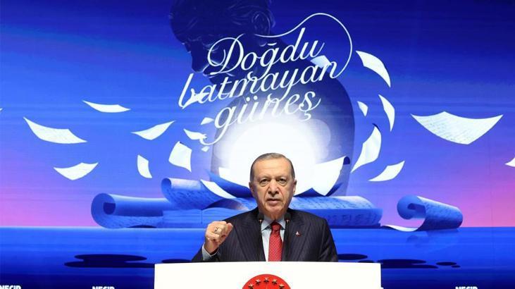 Cumhurbaşkanı Erdoğan, “Sanatların sultanı olarak tarif ettiği şiirle, mutlak hakikati aramıştır. Necip Fazıl'a göre mutlak hakikat Allah'tır. Şiir Allah'ı sır ve güzellik yolunda arama işiydi. Şiire ve Allah'ın mahrem ülkesi meçhuller aleminin derbeder seyyahı olarak gördüğü şaire çok önemli görevler yüklüyordu. Üstad, gerçekleştirmek için bütün bir ömrünü vakfettiği ideallerini ancak ve ancak genç kuşakların gerçeğe dönüştürebileceğine inanıyordu. Bu gençliğin maya tutması için de Üstad kendi ifadesiyle 30 yıl boyunca uğraştı, didindi, bu uğurda zindanlara atıldı. Tüm yasaklara, tüm engellemelere rağmen 35 yıl boyunca neşrettiği Büyük Doğu Dergisi ve kurucusu olduğu Büyük Doğu Cemiyeti'yle özellikle gençlere ilham aşılamanın özgüven ve cesaret vermenin gayretindeydi. O mücadelesini fildişi kulelerde değil, milletin içinde milletiyle bilhassa gençlerle birlikte yürüttü. Anadolu'yu karış karış gezerek binlerce kişinin katıldığı konferanslar tertip etti. Sayısız tahkibata uğradı. Defalarca hapse girdi. Birçok haksızlığa maruz kaldı fakat inandığı yoldan asla geri adım atmadı. Birisinde hakim bey artık bıktık senden ifadesini kullanınca verdiği cevap çok manidardır. Siz hancı, ben bu yolda yolcu olduğum müddetçe ben buraya daha çok uğrarım. Üstad bu, geleceğin fikir yükünü sırtlayacağına inandığı gençlikten ümidini hiçbir zaman kesmedi. Rabbim bizlere de gençlik yıllarımızda üstadın bu samimi mücadelesine omuz vermeyi bahşetti. Necip Fazıl Kısakürek'in 50'nci muharrirlik ve 40'ncı mücadele yılı jübilesinin takdimini yapmak bu fakire nasip oldu. Üstad hayattayken takdimini yapma bahtiyarlığını yaşamıştık. Vefatından 37 yıl sonra ise en büyük hayali olan Ayasofya'yı açma şerefine de eriştik. Allah'a hamd olsun. 80 yıllık hasretin ardından zincirleri hep birlikte kırdık ve Fatih'in vasiyetine uygun olarak Ayasofya'yı asli kimliğine tekrar kavuşturduk. Ayasofya Camii Kebir aslına rücu etti. Birlikte bu başarı. Üstadın hayalini kurduğu şekilde tıpkı bir kitap gibi. Tıpkı mukaddesatçı Türk gençliğinin kalbi gibi bu yüce mabedi açmayı başardık. Rabbime bir kez daha bizlere bu onuru, bu şerefi Ayasofya'nın esaretine son verme bahtiyarlığını bahşettiği için sonsuz hamd ediyorum" dedi.