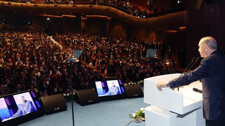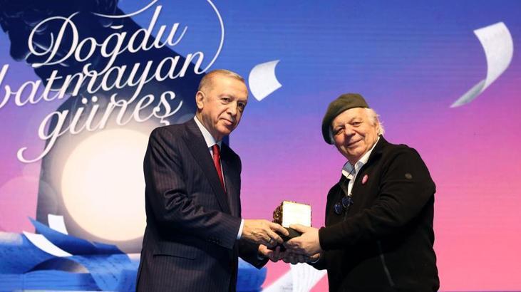 Cumhurbaşkanı Erdoğan, “Bizler velisinden delisine, esnafından evliyasına kadar şiirle yaşamış, hayatı şiir, şiiri hayat tarzı haline getirmiş bir milletin mensuplarıyız. Yunus Emre'den Karacaoğlan'a, Yahya Kemal'den Ziya Paşa'ya, Şeyh Galip'ten, Necip Fazıl'a, Nazım Hikmet'ten, Abdurrahim Karakoç'a tek solukta yüzlerce birinci sınıf şairi saymak mümkündür. Kanuni Sultan Süleyman'ın divanında 4 bin civarında gazel vardır. Necip Fazıl'ın sadece otel odaları şiirindeki her beyit nasıl bir şaheserse Muhibbi Divanı'ndaki, Fatih Divanı'ndaki gazeller de aynı şekilde eşsiz birer sanat eseridir. Ancak bu hazineden yeterince istifade edemediğimizi görüyoruz. Elbette bunda dilde yaşanan keskin ve ani kopuşun çok büyük tesiri var. Milletimizin binlerce yıllık beslenme kaynaklarıyla bağını zayıflatan bazı hamlelerin açtığı boşluğu belki de hiçbir zaman tam manasıyla telafi edemeyeceğiz. Kültür sanat hayatımızın serpilip büyümesine ket vuran bir diğer husus varlığını halen devam ettiren ideolojik al gülüm ver gülüm ilişkileridir. Sinemadan tiyatroya, romandan müzeye kadar birçok alanda iç içe geçmiş çok katmanlı bu ilişkilere rastlıyoruz. Bu ilişkiler ülkemizde yeni, özgür seslerin, yeni kabiliyetlerin çıkmasına da engel teşkil etmektedir. Burada şu hususu açık yüreklilikle ifade etmek durumundayım. Hükümet olarak son 21 yılda attığımız kararlı, cesur ve dirayetli adımlarla siyasetteki vesayet sistemini hamdolsun bitirdik. Türk siyasetini, tarihinin en çoğulcu en renkli temsil kabiliyeti en yüksek yapısına kavuşturduk. Ama kültür sanat alanındaki vesayeti sona erdirmekte henüz muvaffak olamadık. Kaliteden, nitelikten, başarıdan ziyade ideolojik akrabalığı, referans alan vesayet düzeni, kültür sanat camiasında varlığını halen sürdürüyor. Türkiye'ye dair pek çok tartışmada bu zihniyetin tarafgir ve karanlık yüzüne şahit oluyoruz" diye konuştu.