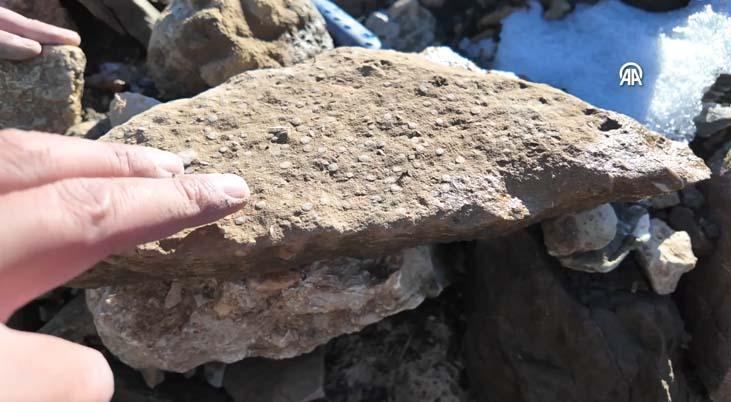 "Çok sayıda mercan resifi (denizlerin sığ yerlerinde, binlerce yıl boyunca, sert mercanların birikmesiyle oluşur) var, taşlaşmış mercanlar var. Çok sayıda da kırılmış, parçalanmış kabukluların yığılması halinde oluşmuş bazı başka fosil oluşumları var. Deniz canlılarının kayaların içerisinde fosilleşmiş olarak bulunması bu dağlık bölgenin bir zamanlar denizlerle kaplı olduğunu bize anlatıyor. Bu alanın milyonlarca yıl öncesine ait olduğu kesin. Fosillerin incelemesini laboratuvarda yapıp, buradaki denizin yaşını ortaya koyacağız."