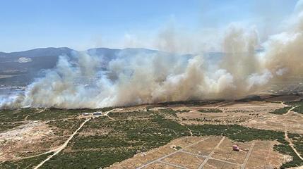 İzmir Orman Bölge Müdürlüğü'ne ait 2 uçak, 1 helikopter, 3 arazöz, 1 su ikmal aracı bölgeye sevk edildi. Alevlere havadan ve karadan sürüyor. (Kadir ÖZEN/DHA)