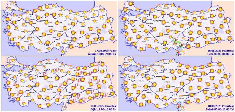 Parçalı ve az bulutlu, zamanla çok bulutlu, bu gece ve yarın (Pazartesi) sabah saatlerinde kıyı kesimleri yerel olmak üzere sağanak ve gök gürültülü sağanak yağışlı