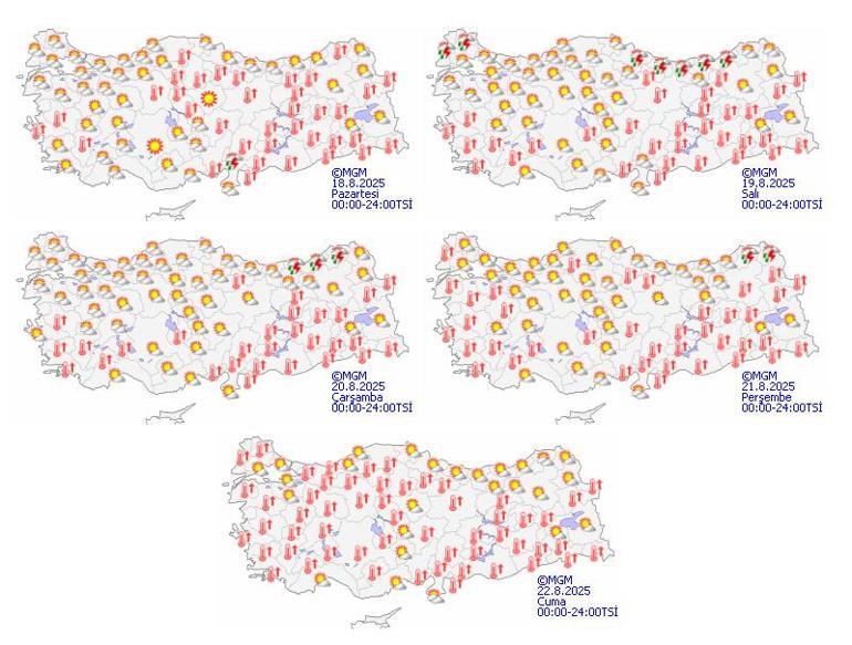 Meteoroloji Genel Müdürlüğü tarafından yapılan tahminlere göre: Ülkemizin kuzey kesimleri ile Doğu Akdeniz’in parçalı, yer yer çok bulutlu, Osmaniye çevreleri ile Adana’nın kuzey kesimleri ve Hatay kıyılarının yerel olmak üzere sağanak ve gök gürültülü sağanak yağışlı, diğer yerlerin az bulutlu ve açık geçeceği tahmin ediliyor.