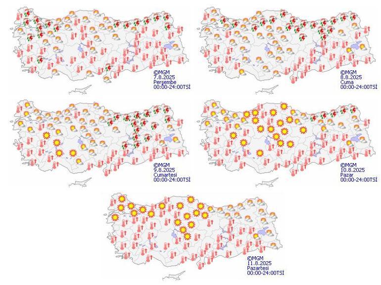 Meteoroloji Genel Müdürlüğü tarafından yapılan tahminlere göre: Ülkemizin kuzey kesimlerinin parçalı, yer yer çok bulutlu, (Bilecik ve Çanakkale hariç) Marmara, Ege'nin iç kesimlerinin kuzey ve güneydoğusu, (Samsun hariç) Orta ve Doğu Karadeniz kıyıları ile Gümüşhane çevreleri ve Doğu Anadolu'nun kuzeydoğusu ile Van'ın doğusu ve İskenderun Körfezi çevrelerinin yerel sağanak ve gök gürültülü sağanak yağışlı, diğer yerlerin az bulutlu ve açık geçeceği tahmin ediliyor. Bu akşam ve gece saatlerinde beklenen yağışların İstanbul ve Balıkesir çevrelerinde yerel kuvvetli olması bekleniyor.