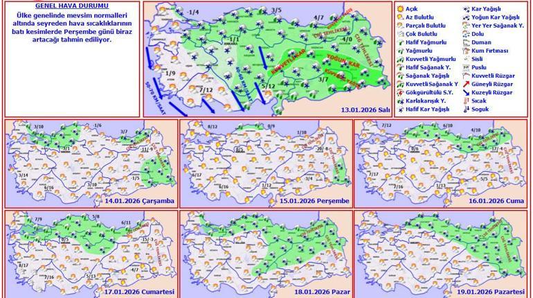 Meteoroloji Genel Müdürlüğü tarafından yapılan tahminlere göre: Ülkemiz genelinin çok bulutlu, Kuzey Ege kıyıları, Çanakkale, Van ve Iğdır dışında kalan tüm bölgelerin aralıklı yağışlı geçeceği tahmin ediliyor. Yağışların; Kıyı Ege, Akdeniz kıyıları, Orta ve Doğu Karadeniz kıyıları ve Güneydoğu Anadolu’nun batısı ile Manisa, Denizli, Sinop, Tokat, Batman ve Siirt çevrelerinde yağmur ve sağanak, yağış alan diğer yerlerde karla karışık yağmur ve kar şeklinde olması bekleniyor. Yağışların, Doğu Akdeniz, Antalya'nın doğusu, Doğu ve Güneydoğu Anadolu’nun batısı ile Samsun, Ordu, Tokat, Giresun, Trabzon, Gümüşhane, Bayburt, Bingöl ve Diyarbakır çevrelerinde yerel olarak kuvvetli olması bekleniyor. Gece ve sabah saatlerinde Marmara ile iç ve doğu bölgelerde buzlanma ve don olayı bekleniyor. Doğu Karadeniz’in iç kesimlerinin yüksekleri ile Doğu Anadolu’nun doğusunda yüksek kar örtüsüne sahip eğimli kesimlerinde çığ tehlikesi bulunmaktadır.