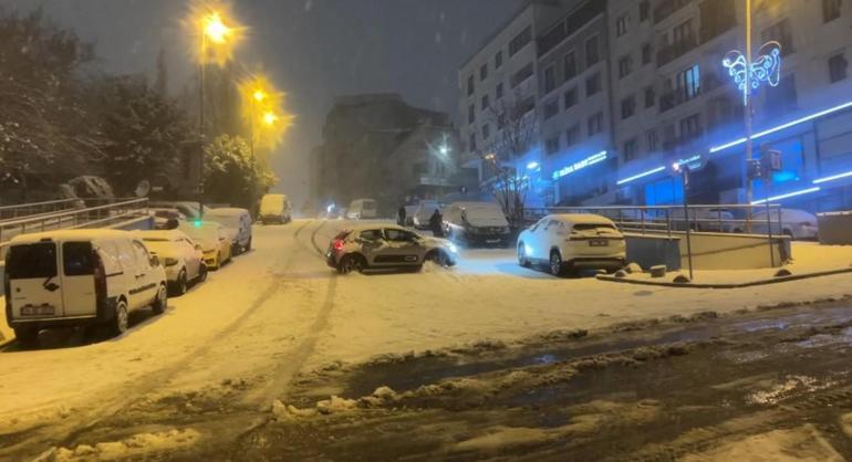 Kar yağışı ile birlikte İstanbul Bayrampaşa'da sokaklar piste döndü. Yokuşta duramayan araçların kaza yaptığı anlar kameraya yansıdı.
