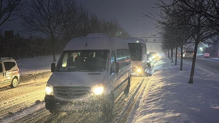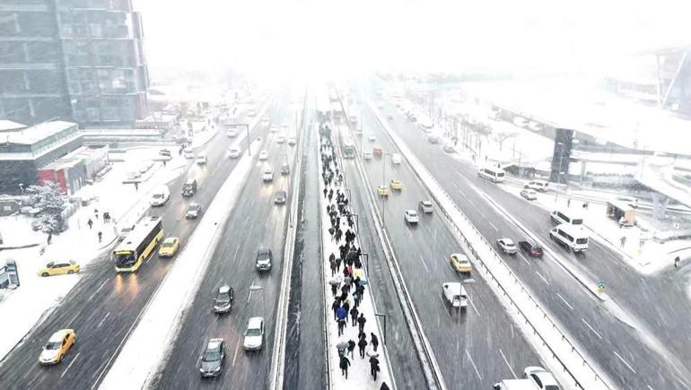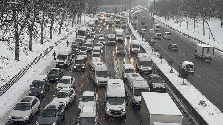 Kent genelinde, milyonlarca kişinin işe gitmek için yola çıkması ve kar yağışının etkisiyle ana arter, cadde ve yollarda araçlar güçlükle ilerliyor.