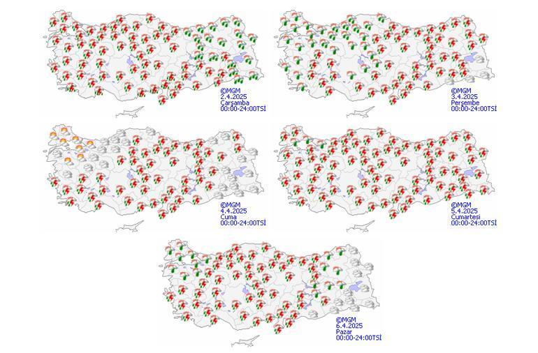 Meteoroloji Genel Müdürlüğü tarafından yapılan tahminlere göre: Ülkemiz genelinin parçalı ve çok bulutlu, aralıklı sağanak ve gök gürültülü sağanak yağışlı geçeceği tahmin ediliyor. Yağışların; Batı Akdeniz kıyıları, Doğu Akdeniz, Güneydoğu Anadolu'nun batısı, Doğu Anadolu'nun güneydoğusu ile Kocaeli, Muğla, Düzce, Bolu, Tunceli, Bingöl ve Siirt çevrelerinde yer yer kuvvetli olması bekleniyor. Akdeniz, Güneydoğu Anadolu ile Doğu Anadolu’nun güneydoğusunda toz taşınımının görüleceği tahmin ediliyor.