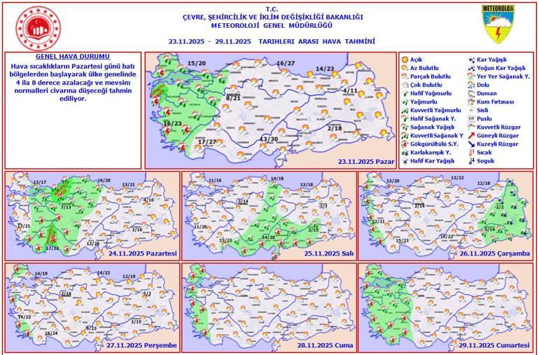Meteoroloji Genel Müdürlüğü tarafından yapılan tahminlere göre: Yurdun batı kesimlerinin parçalı ve çok bulutlu, Marmara, Ege, Akdeniz, İç Anadolu (Sivas hariç) ile Batı Karadeniz bölgelerinin sağanak ve gök gürültülü sağanak yağışlı, diğer yerlerin az bulutlu geçeceği tahmin ediliyor. Yağışların, Marmara'nın batısı, Ege (Kutahya hariç), Batı Akdeniz ile Mersin çevrelerinde kuvvetli, Ege'nin güney kıyıları ile Edremit Körfezi çevrelerinde yer yer çok kuvvetli olması bekleniyor. İç ve doğu kesimlerde sabah ve gece saatlerinde pus ve yer yer sis hadisesi görüleceği tahmin ediliyor.