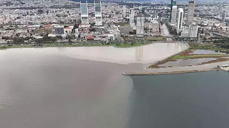 İzmir Körfezi'nin bazı bölümleri kahverengiye büründü. Derelerden denize akan çamurlu suyun neden olduğu renk değişimi dron ile görüntülendi.