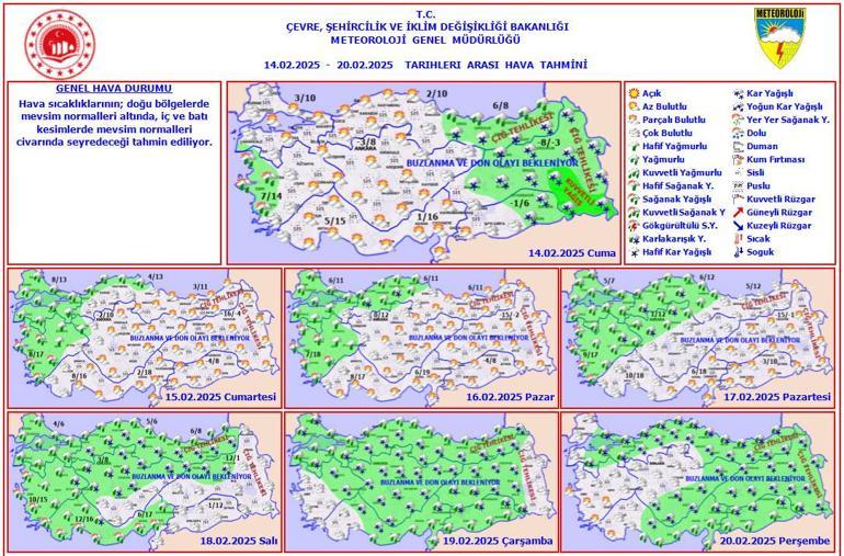 ÇIĞ TEHLİKESİ İLE BUZLANMA VE DON OLAYI UYARISI: Doğu Karadeniz’in iç kesimlerinin yüksekleri ile Doğu Anadolu'nun doğusunun dik ve eğimli yamaçlarında çığ tehlikesi ile yurdun iç ve doğu kesimlerinde yer yer kuvvetli olmak üzere buzlanma ve don olayı beklendiğinden meydana gelebilecek olumsuzluklara karşı dikkatli ve tedbirli olunması gerekmektedir.
