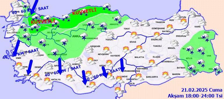 RÜZGAR: Genellikle kuzeyli yönlerden hafif, ara sıra orta kuvvette, Rüzgarın; Marmara, Kıyı Ege, Akdeniz’in iç kesimleri ile İç Anadolu’nun güneyinde kuzeyli yönlerden kuvvetli olarak (40-60 km/saat) esmesi bekleniyor.