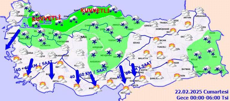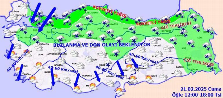 Yağışların; Batı Karadeniz, Orta ve Doğu Karadeniz kıyıları ile İstanbul, Kocaeli, Sakarya, Yalova, Bursa, Balıkesir'in kuzeyinde yerel kuvvetli olması bekleniyor. Rüzgarın; Marmara, Kıyı Ege, Akdeniz’in iç kesimleri ile İç Anadolu’nun güneyinde kuzeyli yönlerden kuvvetli olarak (40-60 km/saat) esmesi bekleniyor. Gece ve sabah saatlerinde kuzey, iç ve doğu kesimlerde buzlanma ve don olayı bekleniyor. Doğu Karadeniz’in iç kesimlerinin yüksekleri ile Doğu Anadolu’nun yüksek ve dik yamaçlarında çığ tehlikesi bulunmaktadır.