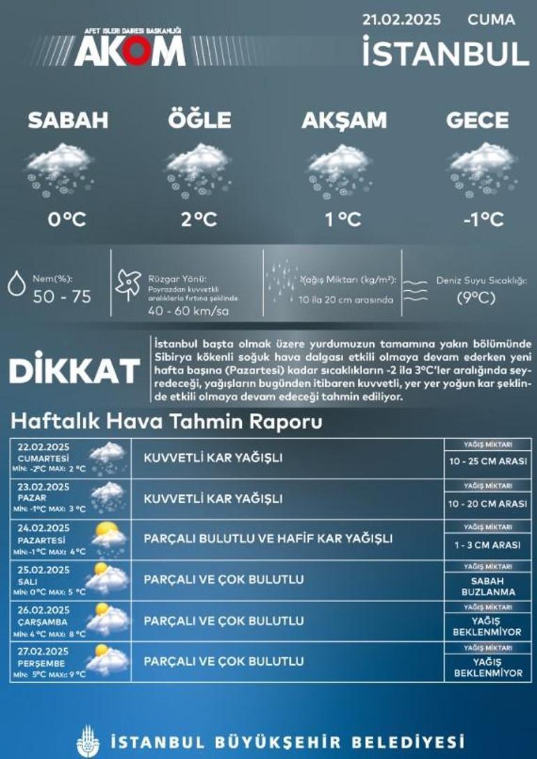 AKOM'dan yapılan son dakika açıklamasında da, 'İstanbul başta olmak üzere yurdumuzun tamamına yakın bölümünde Sibirya kökenli soğuk hava dalgası etkili olmaya devam ederken yeni hafta başına (Pazartesi) kadar sıcaklıkların -2 ila 3°C'ler aralığında seyredeceği, yağışların bugünden itibaren kuvvetli, yer yer yoğun kar şeklinde etkili olmaya devam edeceği tahmin ediliyor.' denildi.