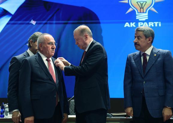 Erdoğan toplantıda, partisine katılanlara rozet taktı