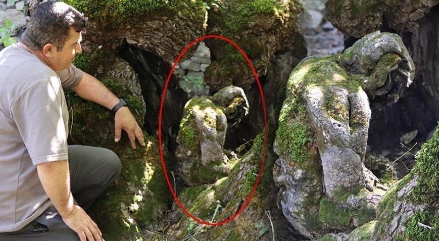 Devasa dut ağacının gövdesinde yıllar içinde oluşan derin yarıklar yere oturmuş ve başını eğmiş bir insan figürünü andırıyor. Bu görüntü, mahallelinin yanı sıra bölgeyi ziyaret eden doğa tutkunlarının da ilgisini çekiyor.