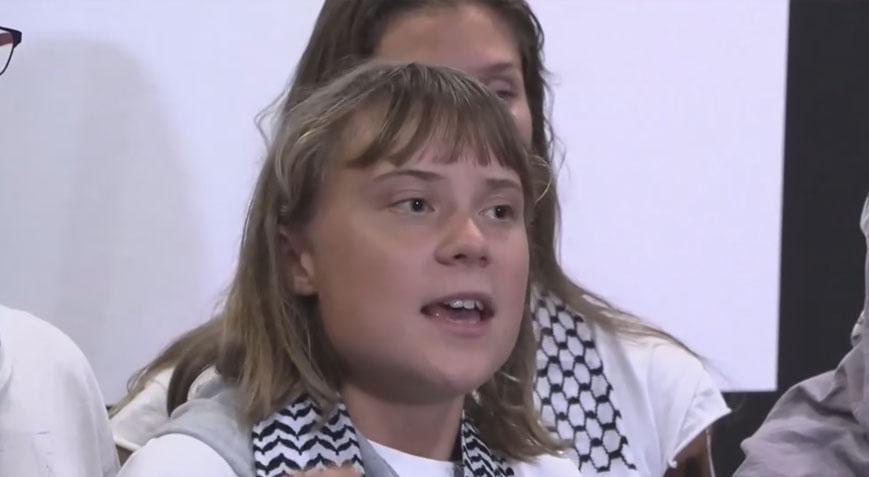 Thunberg, "Çünkü ülkelerimiz yapmalarını gerekenleri yapmadı. Liderlerimiz bizi temsil etmiyor. Bu insanların var olmasını istiyoruz. Bu yaşananlar utanç verici. İsrail'in burada soykırımı devam ettiriyor ve bir nüfusu yok etmeye çalışıyor. Uluslararası hukuku çiğnediler, insanları aç bıraktılar. Bu savaş suçlarını engelleyemiyoruz, biz gözlerimizi Gazze'den ayıramayız. Bu soykırımları bizim hükümetlerimiz tarafından destekleniyor. Bunu durdurmakta bize düşüyor. Biz kahraman değiliz, biz yapılacak en ufak şeyi yapıyoruz. Bizim yaptığımız sadece onların çağrılarına cevap vermekti" dedi.